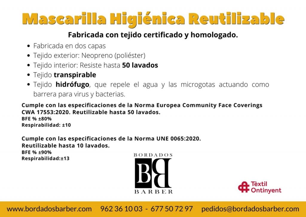 Protegernos a nosotros y a los nuestros es esencial, y no hay mejor forma de hacerlo que con nuestras mascarillas bordadas y personalizadas para empresas y colectivos. En Bordados Barber somos especialistas en todo tipo de bordados, por lo que creemos que no hay mejor forma de plasmar nuestro arte, que creando mascarillas de calidad con diseños totalmente personalizados y únicos.