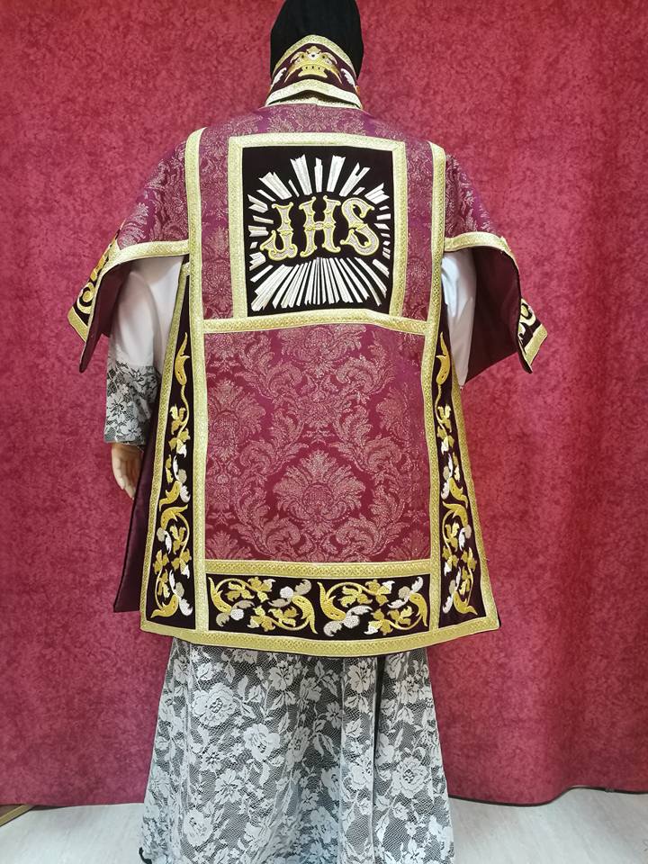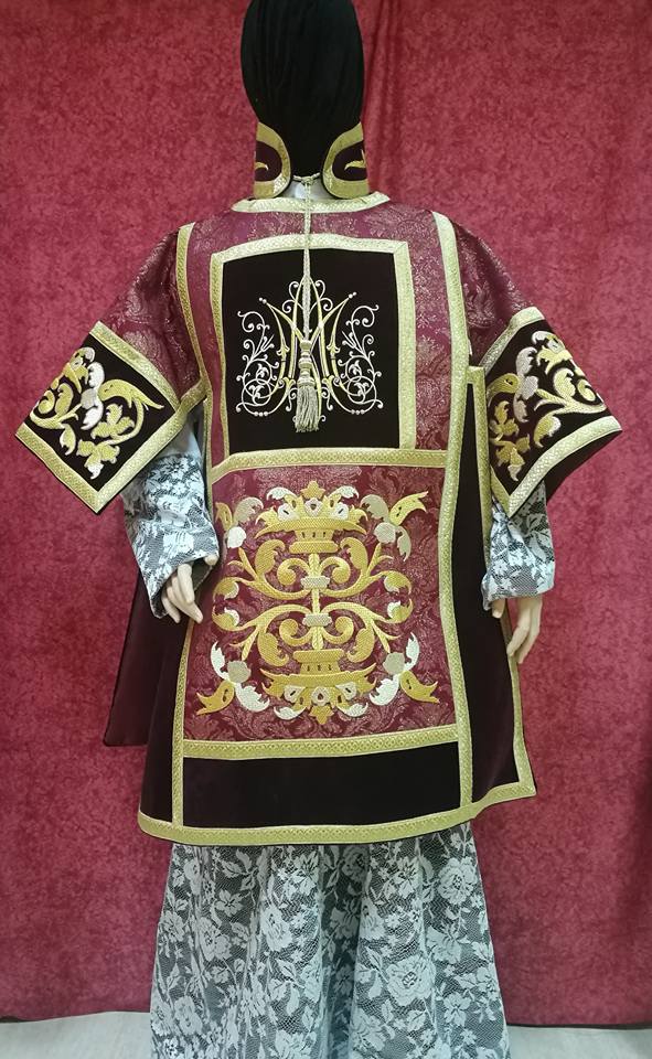 Hemos realizado dos propuestas para poder mostrar las diferentes posibilidades que tiene este tipo de traje. Hay un JHS en la trasera sobre los hombros con el bordado en las piezas exteriores del traje de pertiguero, en el caso del frente hemos puesto toda la carga de bordado en las dos piezas centrales, en la parte del pecho hemos bordado un Ave Maria muy elaborada con dos colores de oro y en la parte baja está el motivo vegetal principal del cual hemos sacado el resto de piezas, las mangas son dos cuadrantes que nos permiten ofrecer una buena carga de bordado.